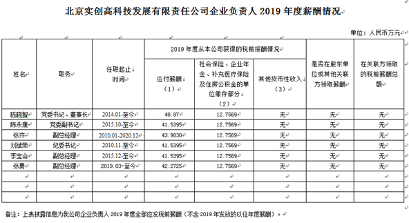 北京实创高科技发展有限责任公司企业负责人2019年度薪酬情况表