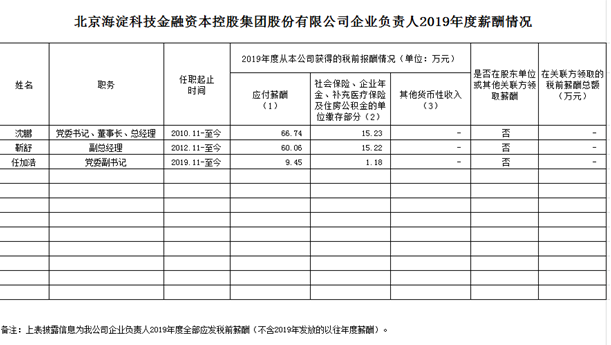 北京海淀科技金融资本控股集团股份有限公司企业负责人2019年度薪酬情况