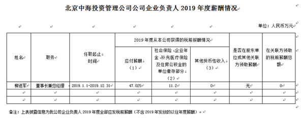 北京中海投资管理公司企业负责人2019年度薪酬情况