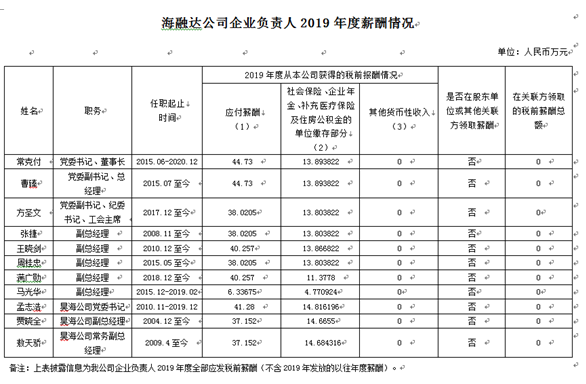 北京海融达投资建设有限公司企业负责人2019年度薪酬情况