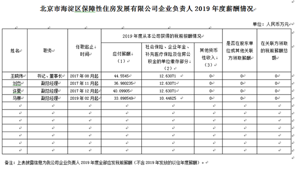 北京市海淀区保障性住房发展有限公司企业负责人2019年度薪酬情况