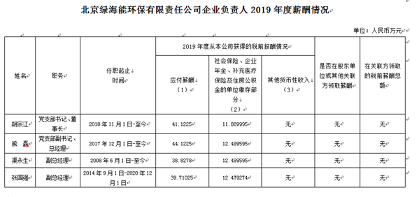 北京绿海能环保有限责任公司企业负责人2019年度薪酬情况