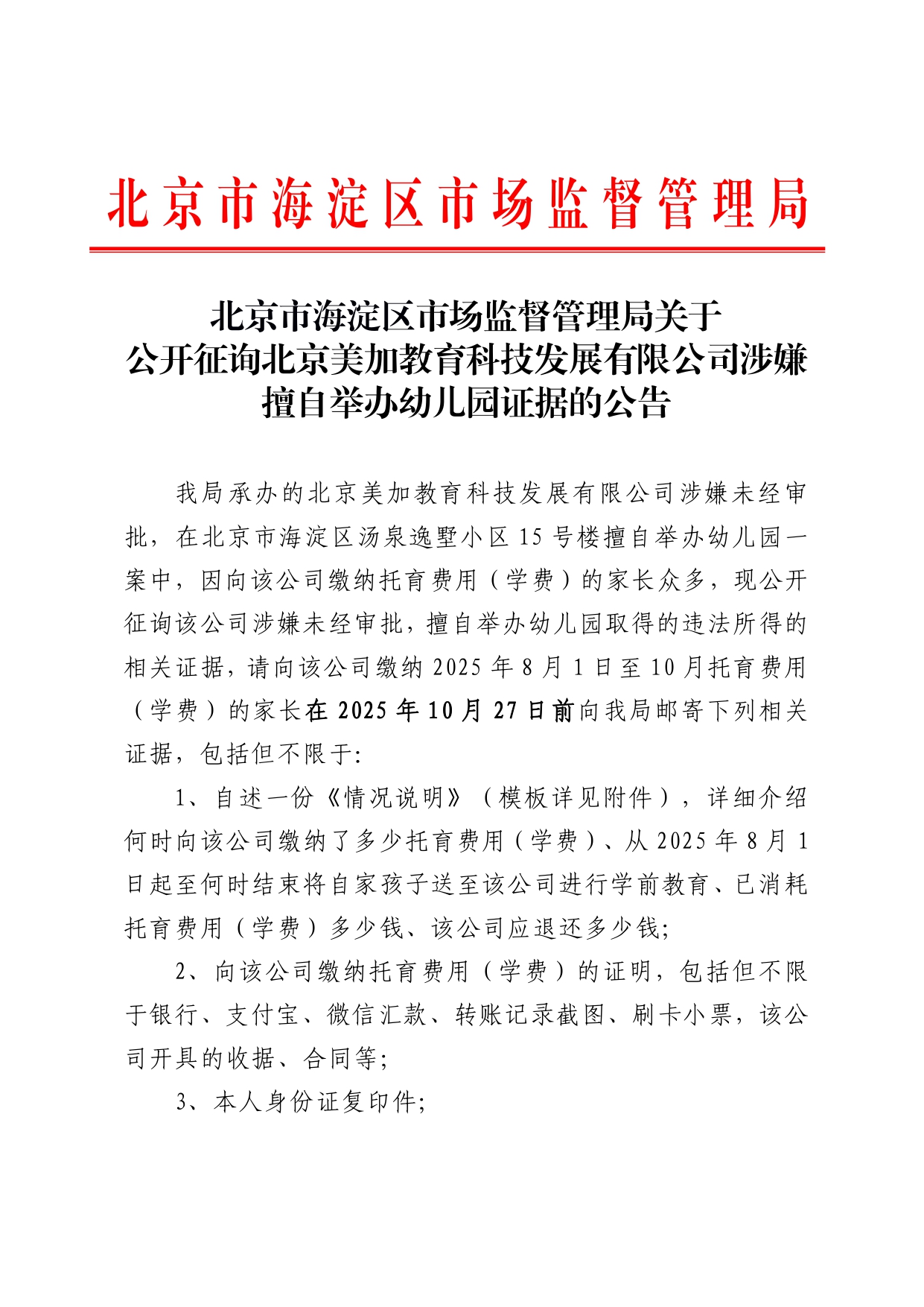 | 内容概述 | 北京市海淀区市场监督管理局关于公开征询北京美加教育科技发展有限公司擅自举办幼儿园证据的公告 | ||