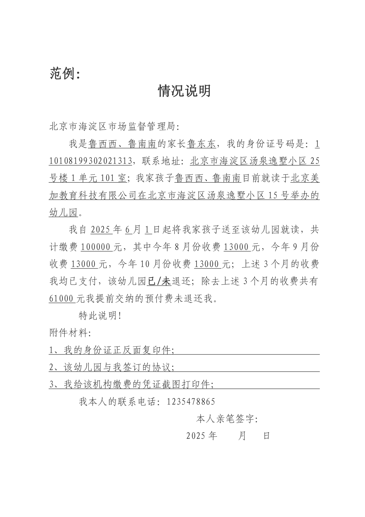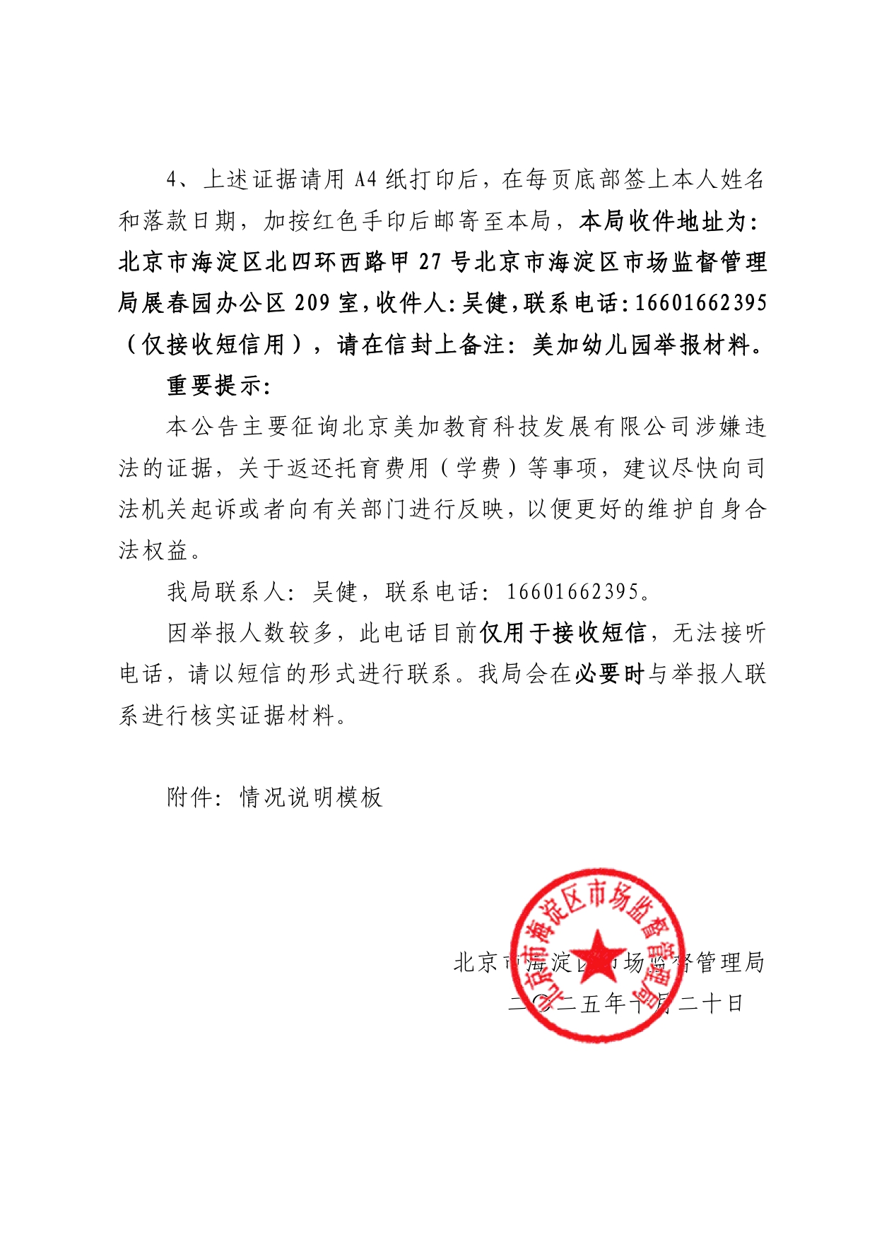 | 信息名称 | 北京市海淀区市场监督管理局关于公开征询北京美加教育科技发展有限公司擅自举办幼儿园证据的公告 | ||