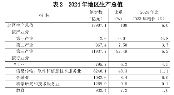 经济增长:初步核算,全年实现地区生产总值12907.1亿元,按不变价格计算,比上年增长6.0%。分产业看,第一产业实现增加值2.0亿元,增长24.8%;第二产业实现增加值967.4亿元,增长3.7%;第三产业实现增加值11937.7亿元,增长6.2%。三次产业构成为0.01:7.50:92.49。