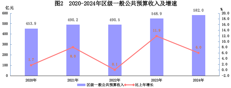 财政收入:区级一般公共预算收入完成582.0亿元,比上年增长6.0%。其中,增值税214.6亿元,增长22.1%;企业所得税144.8亿元,增长3.0%。