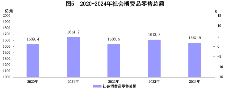 市场消费:2024年全年实现社会消费品零售总额1557.9亿元。