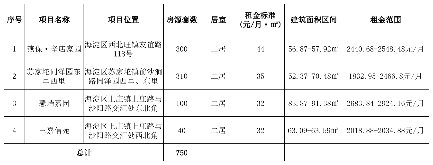此次配租项目为燕保•辛店家园、苏家坨同泽园东里西里、馨瑞嘉园、三嘉信苑4个项目750套房源,均由北京保障房中心有限公司持有并运营。具体情况如下: