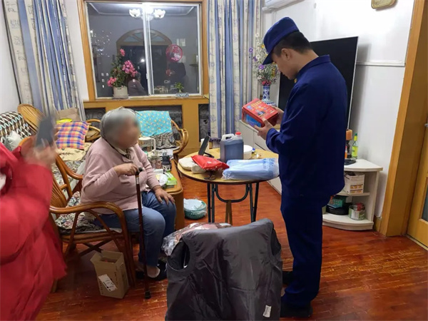 针对独居老人、残障人士等消防重点关爱群体,工作人员上门安装联网烟感报警器,并同步发放消防四件套——灭火器、灭火毯、阻燃床品、防烟面罩。在社区居民王阿姨家中,消防员现场演示烟感报警器的联网功能:“当烟雾浓度超标,设备会立即向社区消防平台推送警报,同时触发高分贝蜂鸣提醒。”结合阻燃床品的防火特性与防烟面罩的正确佩戴方法,工作人员通过“手把手教学+情景模拟”,确保每位老人掌握“提拔握压”灭火器操作要领及“低姿捂鼻”逃生技巧,实现“设备安装+技能传授”双到位。