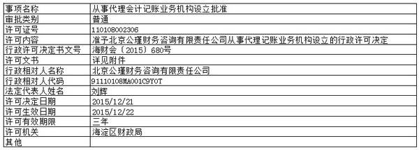 准予北京公瑾财务咨询有限责任公司从事代理记账业务机构设立的行政许可决定.doc