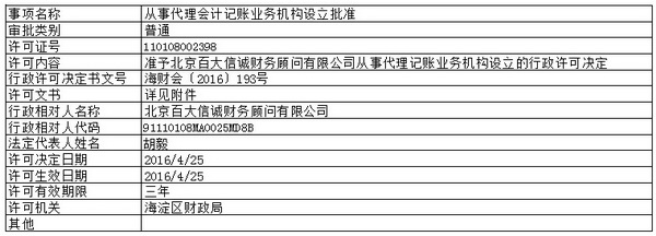 准予北京百大信诚财务顾问有限公司从事代理记账业务机构设立的行政许可决定.doc