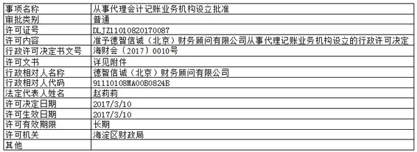 准予德智信诚(北京)财务顾问有限公司从事代理记账业务机构设立的行政许可决定.doc