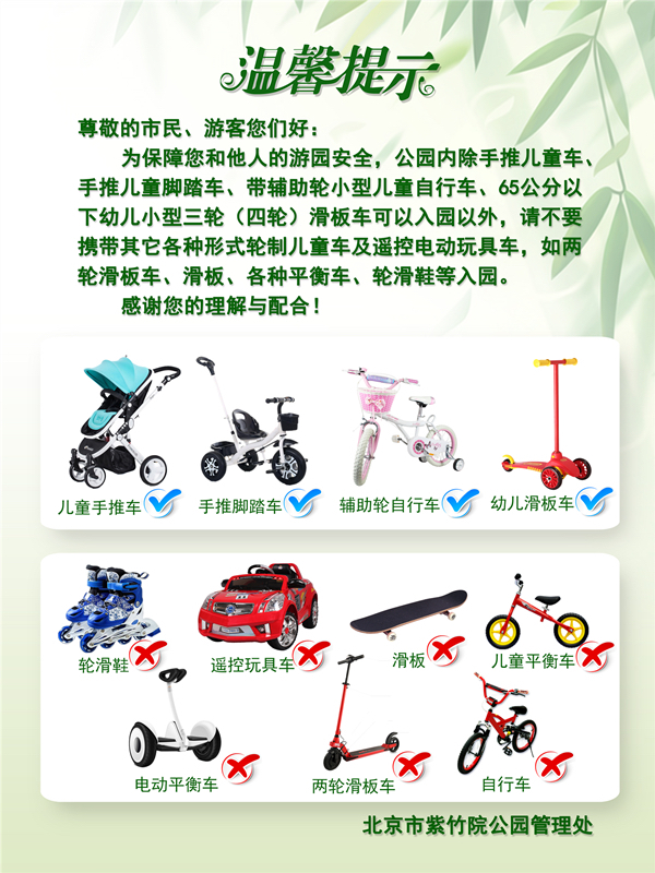 4.除老年人、残疾人、儿童使用的手摇、手推轮椅车和儿童车外,其他车辆未经允许不得进入公园。
