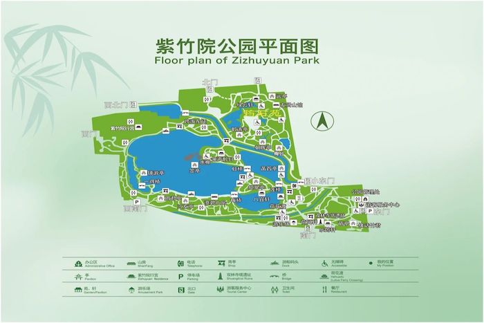 紫竹院公园始建于1953年,因园内西北部有清代皇家行宫建筑群福荫紫竹院而得名。全园占地45.73公顷,水面约占三分之一,南长河、双紫支渠穿园而过。园内总体布局为“三湖两岛一堤”,是一座自然式山水园林。本园造景模山范水求其自然,掇石嶙峋精心安置,亭、廊、轩、馆错落有致,修竹花木巧布其间,举目皆如画,四时景宜人。春风暖筱百花舒,夏霭轻舟翠盖浮,秋雨润芦枫叶艳,冬云瑞雪映松竹。中部青莲岛上有“八宜轩”、“竹韵景石”;明月岛上有“问月楼”、“箫声醉月”;西部有“跨海东征”、“紫竹垂钓”;南部有“澄碧山房”及儿童乐园;长河北部是独具江南园林特色的“筠石苑”,那里山势蜿蜒高低,水体聚散潆洄。植物配置精细,构筑轻巧。淡雅、清秀、幽静而别致。有“清凉罨秀”、“江南竹韵”、“竹深荷静”、“友贤山馆”、“绿云轩”、“斑竹麓”、“知弈庐”诸景。