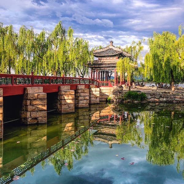 颐和园前身为清漪园,始建于清朝乾隆十五年(1750),咸丰十年(1860)被英法联军烧毁。光绪十二年(1886),清廷挪用海军经费等款项开始重建,并于两年后取用今名,作为慈禧太后的颐养之所。一九〇〇年又遭八国联军破坏,一九〇二年修复。中华人民共和国成立后,几经修缮,颐和园陆续复建了四大部洲、苏州街、景明楼、澹宁堂、颐和园博物馆、耕织图等重要景区。