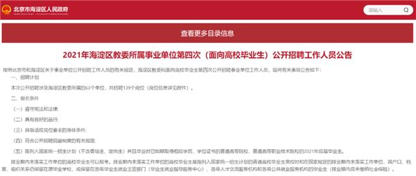 2021年海淀区教委所属事业单位第四次(面向高校毕业生)公开招聘工作人员公告