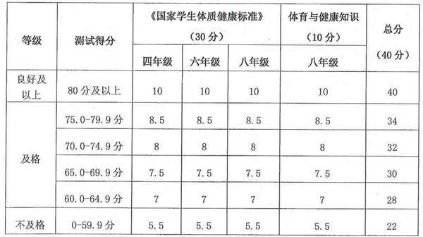 考核根据《国家学生体质健康标准(2014 年修订)》进行,考核时间为四、六、八年级第一学期,每次考核分值10分,共30分。体育与健康知识,10分,考核时间为八年级第二学期。