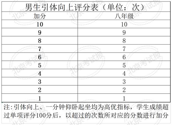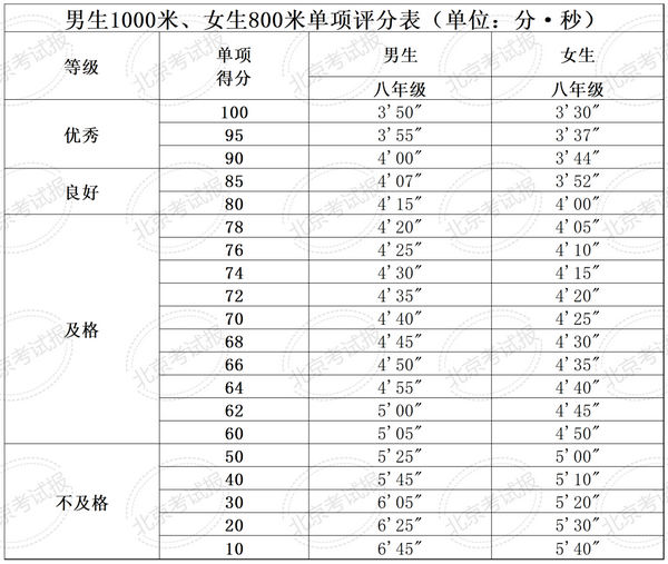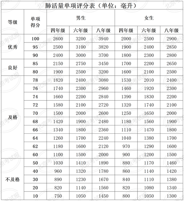 北京市国家学生体质健康测试统测评分表