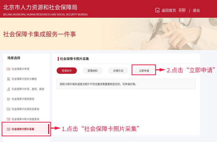2、点击“社会保障卡照片采集”-“立即申请”。