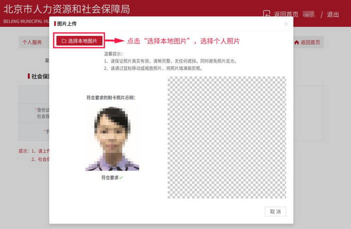 5、打开图片上传页面后,点击左上角“选择本地图片”按钮,上传符合图例要求的本人照片(注:本人近期正面、免冠、彩色、白底、服装与背景的颜色反差较大的电子照片)。