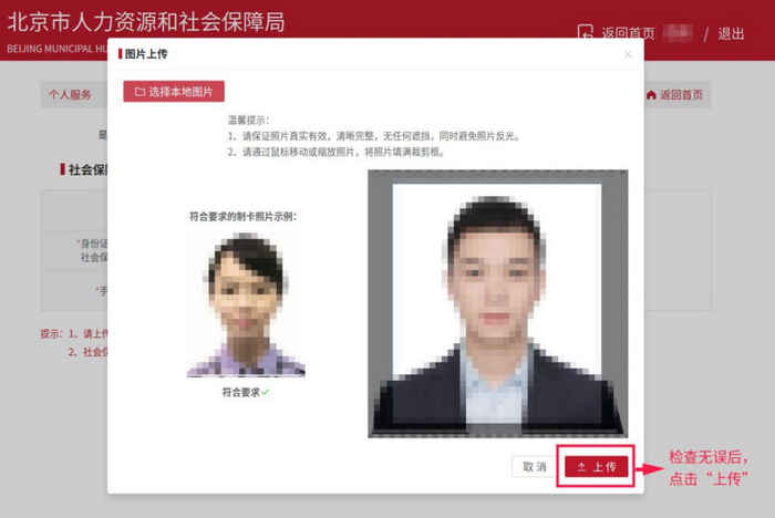 7、检查照片无误后,点击“上传”。(注:如上传照片不符合要求,系统会提示说明,请重新上传个人照片。)