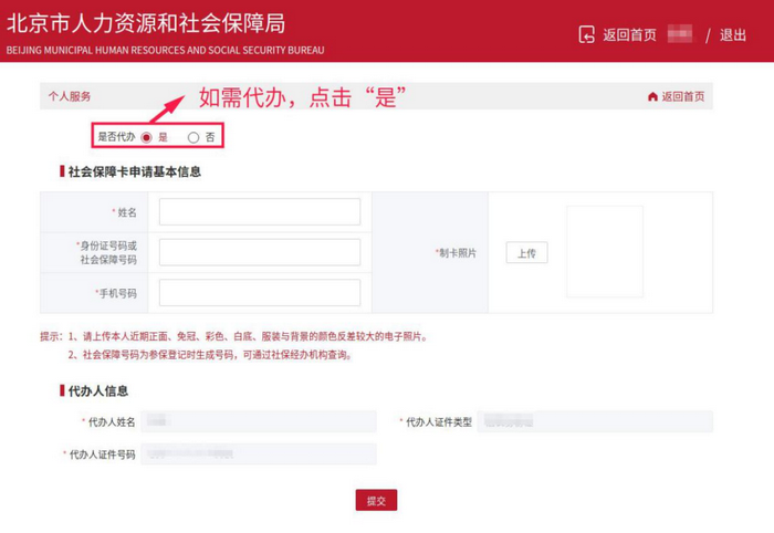 9、如您需为他人代为提交社保卡制卡照片,可在是否代办栏选择“是”。代办人需填写制卡人姓名、身份证号码或社会保障号码、手机号码后,按照步骤4至步骤8的顺序,提交他人制卡照片。(注:选择代办后,代办人信息不可修改)