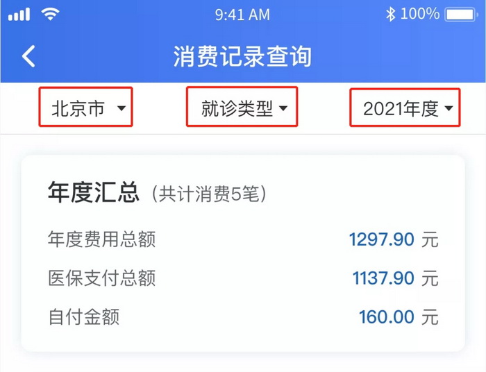 您还可以点击页面头部的筛选项,通过选择参保地、就诊类型和年度来筛选出您想要查询的缴费记录明细。