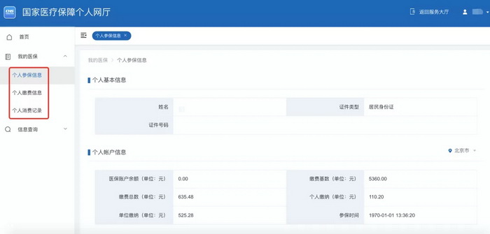 第二步:进入“国家医疗保障个人网厅”页面,可以看到您选择查询的信息详情。您还可以根据自身需求,在左侧菜单栏切换您想要查找的信息。