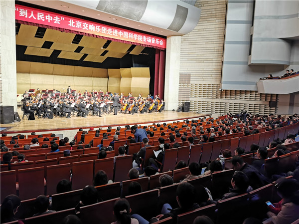 2019年12月16日,由北京市海淀区政协、海淀区文化和旅游局、中关村街道联合主办,中国科学院科技创新发展中心暨北京分院协办的“到人民中去”——北京交响乐团走进中国科学院专场音乐会在海淀剧院精彩奏响,为包括9位中科院院士、46家科研院所近千名科技工作者带来一场高水平的音乐盛会,受到观众一致赞誉。海淀区政协主席刘勇、中科院北京分院院长周琪、北京分院分党组书记马扬、北京交响乐团团长孟海东、区文旅局局长陈静等与现场观众共同欣赏演出。演出开始前,周琪院长致辞并将中科院院长、党组书记白春礼院士题写的“到人民中去”书法作品转送海淀区文旅局及北京交响乐团。