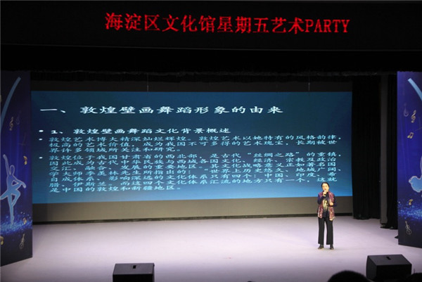 活动伊始,史敏老师从敦煌壁画舞蹈的文化背景说起,以图文并茂的方式,向观众娓娓道来敦煌壁画舞蹈形象的由来、动态呈现以及审美情趣和敦煌舞如何在坚守中求发展等等,并一一介绍了飞天伎乐、药叉伎乐、化生伎乐、金刚力士、迦陵频伽等等伎乐形象的特征,为观众普及了敦煌乐舞的文化知识。