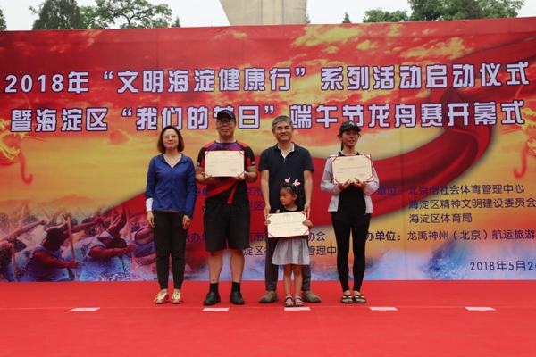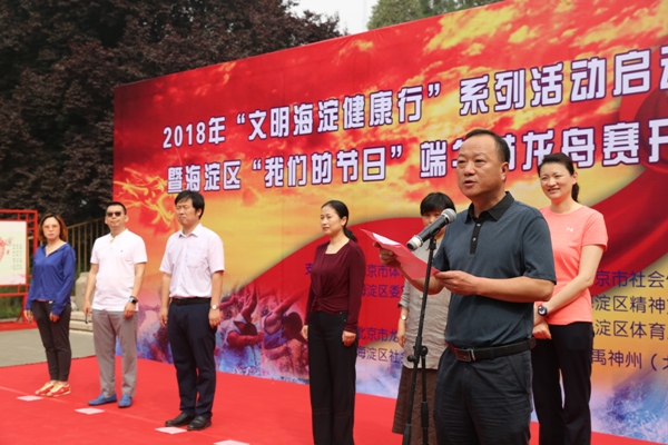5月26日,由北京市体育局、海淀区委宣传部支持,北京市社会体育管理中心、海淀区精神文明建设委员会办公室、海淀区体育局主办,北京市龙舟运动协会、海淀区社会体育管理中心承办,龙禹神州(北京)航运旅游开发股份有限公司协办的2018年“文明海淀健康行”系列活动启动仪式暨海淀区“我们的节日”端午节龙舟赛开幕式在北京市龙舟训练基地八一湖隆重举行。