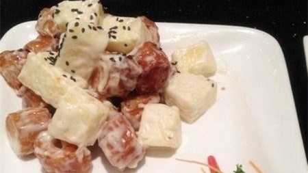 油条酥脆,里面裹着弹弹的虾肉,看着貌似有点油腻的一道菜,其实吃起来格外清新,加上菠萝的甜味,吃起来味道不错哦~