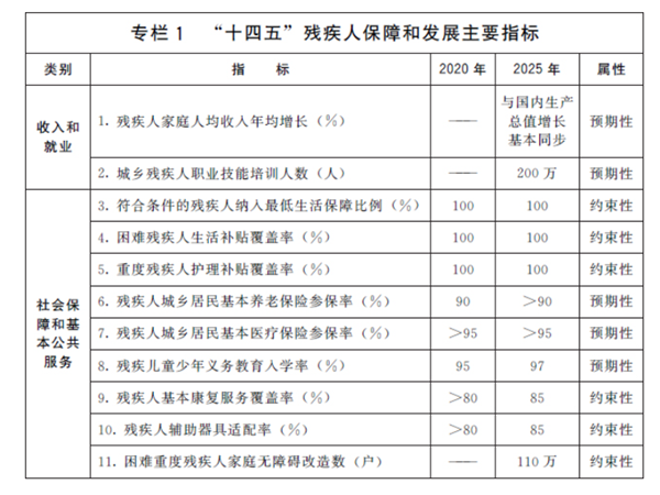 到2025年,残疾人脱贫攻坚成果巩固拓展,生活品质得到新改善,民生福祉达到新水平。多层次的残疾人社会保障制度基本建立,残疾人基本民生得到稳定保障,重度残疾人得到更好照护。多形式的残疾人就业支持体系基本形成,残疾人实现较为充分较高质量的就业。均等化的残疾人基本公共服务体系更加完备,残疾人思想道德素养、科学文化素质和身心健康水平明显提高。无障碍环境持续优化,残疾人在政治、经济、文化、社会、家庭生活等各方面平等权利得到更好实现。残疾人事业基础保障条件明显改善,质量效益不断提升。