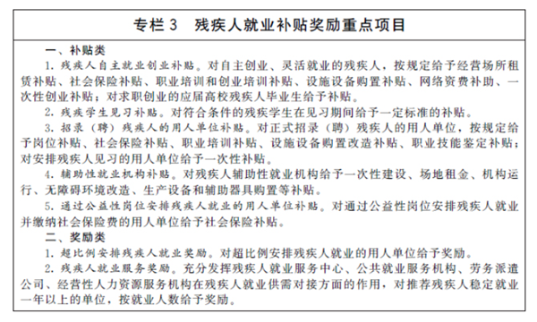 1.完善残疾人就业法规政策。修订实施《残疾人就业条例》。落实残疾人就业支持政策,保障残疾人就业培训、就业服务、补贴奖励等相关资金投入。完善残疾人按比例就业制度,制定党政机关、事业单位、国有企业带头安置残疾人就业办法,合理认定按比例安排残疾人就业形式。加强残疾人就业促进政策与社会保障政策的衔接,纳入低保范围的已就业残疾人可按规定在核算其家庭收入时扣减必要的就业成本,并在其家庭成员人均收入超过当地低保标准后给予一定时间的渐退期。按照国家有关规定,对残疾人就业先进个人和用人单位予以表彰。