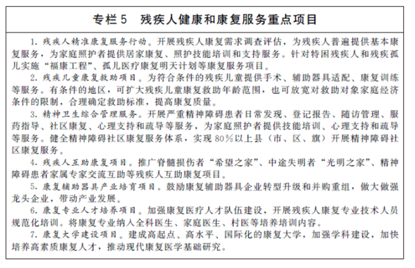 2.提升残疾人康复服务质量。完善残疾人基本康复服务目录,继续实施精准康复服务行动,提升康复服务质量,满足残疾人基本康复服务需求。落实残疾儿童康复救助制度,合理确定康复救助标准,增加康复服务供给,确保残疾儿童得到及时有效的康复服务。加强精神卫生综合管理服务,广泛开展精神障碍社区康复。健全综合医院康复医学科、康复医院(康复医疗中心)、基层医疗卫生机构三级康复医疗服务体系。加强残疾人康复机构建设,完善全面康复业务布局,充实职业康复、社会康复、心理康复等功能。支持儿童福利机构增加和完善康复功能,配备相应的康复设备和专业技术人员,与医疗机构加强合作,提高康复医疗服务能力。加强社区康复,推广残疾人自助、互助康复,促进康复服务市场化发展。建成高起点、高水平、国际化的康复大学,加快培养高素质、专业化康复人才。完善康复人才职称评定办法。加强康复学科建设和科学技术研究,发挥中医药在康复中的独特优势,推动康复服务高质量发展。