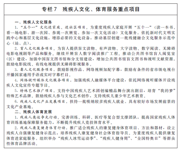 7.提升残疾人公共文化服务。鼓励残疾人参加“书香中国·阅读有我”等公共文化活动,持续开展“残疾人文化周”、“共享芬芳·共铸美好”等残疾人群众性文化艺术活动,推动基层创建一批残健融合文化服务示范中心(站、点),不断满足残疾人文化需求、增强残疾人精神力量。加强中西部和农村地区重度残疾人文化服务,为盲人、聋人提供无障碍文化服务。鼓励电视台、广播电台、网络视听媒体和融媒体中心开设残疾人专题节目。发展特殊艺术,鼓励残疾人参与文化艺术创作和非物质文化遗产传承,扶持残疾人题材图书等出版。扶持残疾人特殊艺术人才和师资培养。举办第十届、第十一届全国残疾人艺术汇演,举办国际特殊艺术交流活动。扶持中国残疾人艺术团和地方残疾人文艺小分队开展基层巡演。