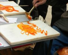 另一头担子的样子差不多,但没有面板,只是一个小炭火炉子支着一口铜锅,里边熬着糖稀,再下面有几个抽屉用来放原料、工具、竹签和木炭。很多手艺人都是既吹糖人又画糖人的。与吹糖人相比,画糖人要简单一些,先用油毡子在大理石板上轻轻蹭一下,一把很精致的小铜勺舀上少许糖稀,微微倾斜着糖稀就缓缓流出,紧接着手往上一提就成了一条糖线,随着手腕的上下左右地翻飞,一个个或人物或动物或花卉就出现在大理石板上,待得凉了定型,用糖稀在糖人身上点两个点,把竹签朝上一贴就拿起来了,再往草把子上一插大功告成。