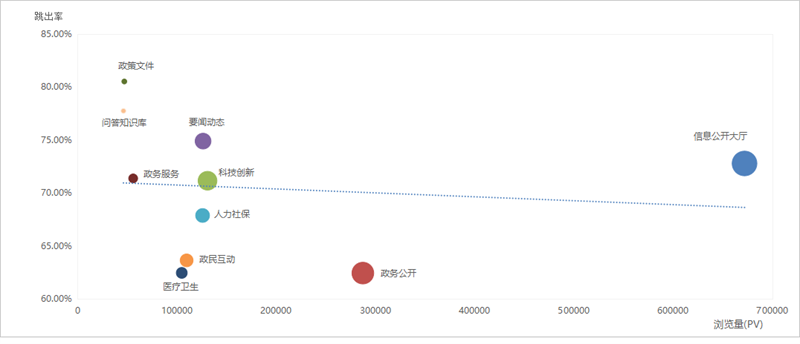 第一季度海淀区政府网站整体运行情况良好,截至3月4日,海淀区网站总访问次数为446528人次,页面浏览量(PV)为1745132页,人均页面浏览量为3.91页/人次,跳出率为68.99%,日均访问次数为6977人次/日,日均页面浏览量为27268页/日。其中区政府网站以信息公开大厅点击量居首,其次为政务公开、科技创新、要闻动态、人力社保、政民互动、医疗卫生、政务服务、政策文件、问答知识库等(如下图)。